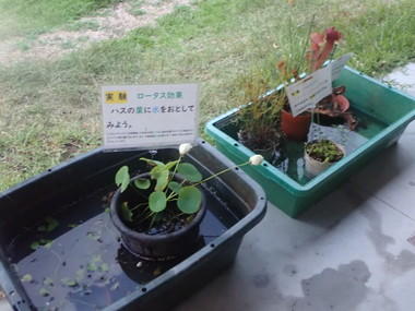 また、体験学習施設前にはヒシモドキや食虫植物3種類、そしてロータス効果の実験ができるようにハスの生体展示を行っています。多くの小学生に植物に関心をもつきっかけになればと思います。