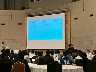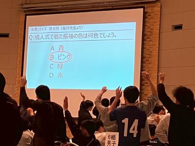 English Fun Night!の後は「修学旅行委員企画」でクラス対抗クイズ大会を行いました。この日のために各クラスの修学旅行委員の皆さんが工夫を凝らしたクイズを準備してくれました。優勝は1組でした。クラスの団結だけでなく学年の先生方との絆も垣間見える企画でした。さらに修学旅行中に誕生日を迎えた生徒へのサプライズ企画もあり、全員でハッピーバースデーの歌を歌い、ケーキのプレゼントもあり、盛大にお祝いしました。思い出に残る誕生日になったことでしょう。明日も一日スキー・スノーボード実習が待っています。明日も楽しみです。