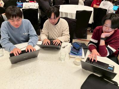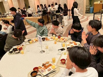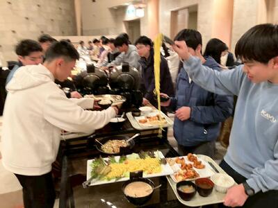19時20分頃に文系3クラスも無事ホテルに到着しました。予定より少し遅れたこともあり、お腹が空いている生徒が多く、皆夕食をたくさん食べて満腹です。特にスペアリブが大人気でした。また、7組(総合自然科学科)はタブレットを持参しており、課題研究の発表に向けて資料の作成に余念がありません。2月7日の発表会も乞うご期待ください。