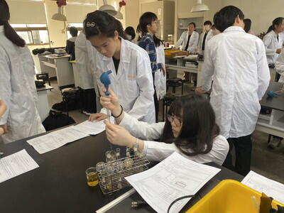 プリントを見ながら実験をしましたが、台南女子の学生も積極的に教えてくれ、助けられました。