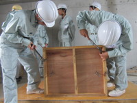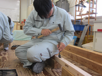 毎年8月に開催される建設サマーセミナーでは、本学科の1~3年生の希望者が建設現場で様々な作業体験を行います。実際に作業を行うことで、学びの定着を深めます。写真はタイル張付け工事、型枠工事、電気工事を体験している様子です。