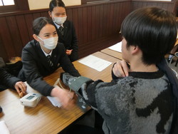 新型コロナ感染症拡大防止を受けて、3年ぶりに「町じゅう美術館」に参加しボランティア活動を行いました。今年は、血圧測定とハンドマッサージを行いました。血圧測定を通して、健康についてのお話をさせていただいたり、ハンドマッサージを通して感謝の気持ちをいただけたり、生徒も地域の方々も笑顔で楽しい時間を過ごすことができました。