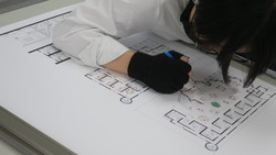 もちろん模型製作だけでなく、図面作成にも多大な時間をかけました。下の写真は色塗りをしている様子ですが、色鉛筆を使って2~3日かけて丁寧に着色していました。これには私も心から尊敬しました!本当にすごい集中力です(>_<)