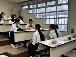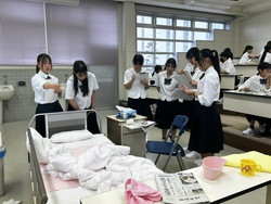 高校1年生が、基礎看護学で学習した知識を活かして、より良い看護につなげる考え方について学びを深める演習を行いました。具体的には、5人グループに分かれ、教員が演じた事例患者さんと看護師の会話の場面から必要な看護援助について考えました。また、援助を考える際は、これまでに習得した知識や理論を用いること、多角的に考えることを意識してグループ内で話し合いました。
