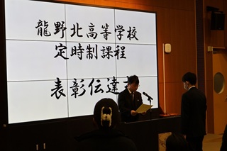 本日、龍野北高等学校アセンブリホールにて、令和7年度3学期始業式が行われました。その後、引き続き表彰伝達式が実施されました。表彰については、次のとおりです。