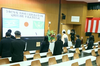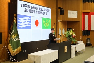 本日、龍野北高等学校アセンブリホールにて、令和7度 表彰伝達式・記念品贈呈式・同窓会入会式に続いて、卒業証書授与式が挙行されました。式は厳粛かつ温かい雰囲気の中、滞りなく進行しました。卒業生の前途が希望に満ちたものであるよう祈念します。