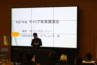 (株)バンズカンパニー 代表取締役社長の竹下 しんいち 様を講師にお迎えして、生徒が将来、社会的・職業的に自立し、社会の中で自分の役割を果たしながら、自分らしい生き方を実現するための力を育むために、ご講演いただきました。