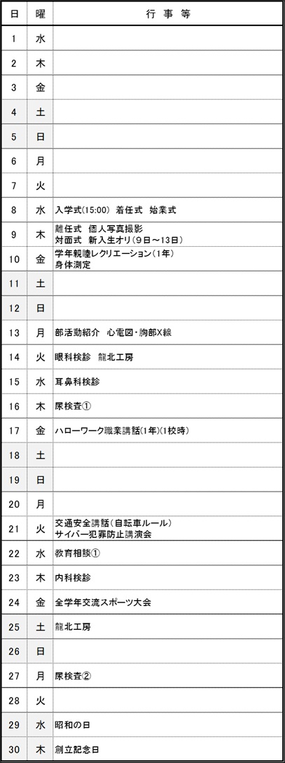 | 日 | 月 | 火 | 水 | 木 | 金 | 土 |