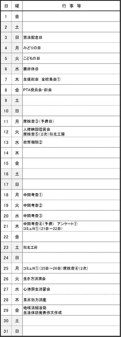 | 日 | 月 | 火 | 水 | 木 | 金 | 土 |