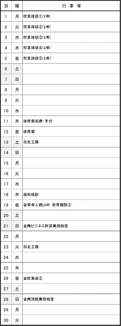| 日 | 月 | 火 | 水 | 木 | 金 | 土 |