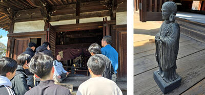 観音堂では、角尺を持った聖徳太子像を拝観し、聖徳太子が建築とも深い関わりをもつ存在として大切にされていることを学びました。
