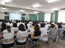 看護職を志す1~3年生の生徒35名が参加し、園田学園女子大学の大納先生に「看護職を目指す」というテーマでお話をいただきました。生徒たちは真剣な様子で聞き入っていました。