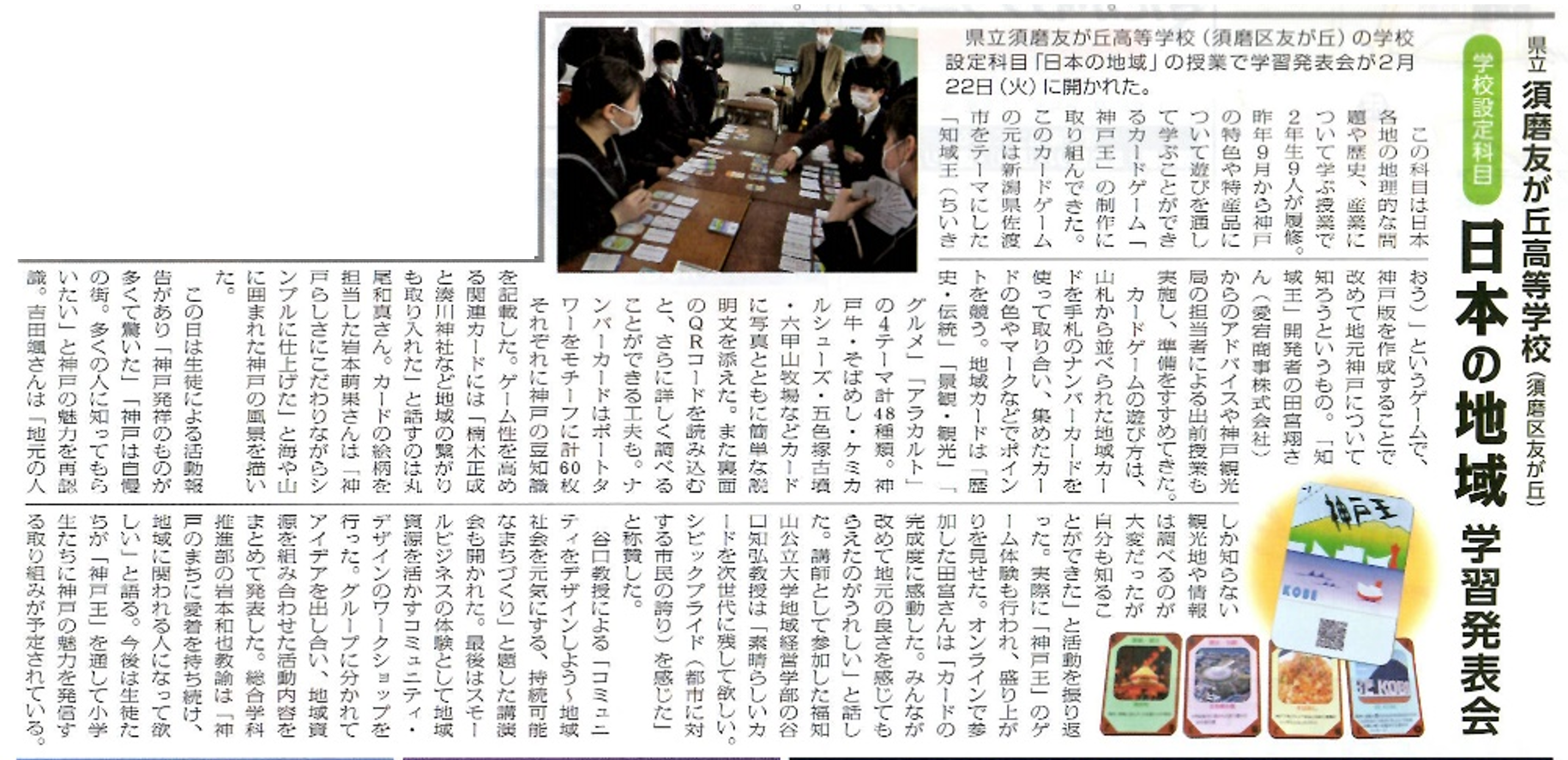 カードゲーム「地域王」をモデルにして、生徒たちが独自に作成した「神戸王」の活動報告の様子が詳細に掲載されました。