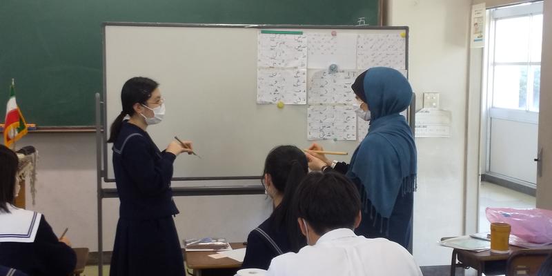 ペルシャ書道体験では、竹で作られた筆を使って生徒それぞれの名前をペルシャ語で書くという活動を行いました。竹で作られた筆の使い方に悪戦苦闘しながらも、ナヒド氏の丁寧な指導の下、最後は美しく名前を書くことができ生徒にとって貴重な体験となりました。
