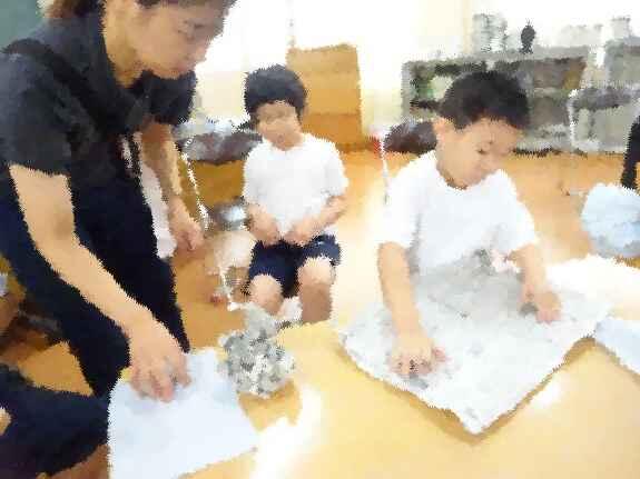後日、もちつき会をひらきました。もち米を蒸すところからはじめ、杵と臼でぺったんこ、ぺったんこ。「おいしくなるように力強くついた。」と5歳児の振り返り談。ついたおもちは丸めてお家に持って帰りました。