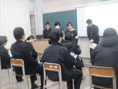 「総合的な探究の時間」で学んだことを題材とした中間発表会を実施しました。卒業予定者は来週より自由登校期間に入るため、最後の発表となります。どの班でも、卒業予定者を中心に、積極的に発表に取り組んだり、他班の発表を真剣に聞く姿が見られました。