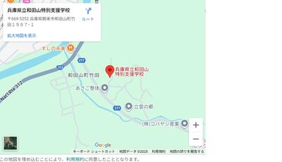 兵庫県立和田山特別支援学校 〒669-5252兵庫県朝来市和田山町竹田1987-1TEL 079-674-0214FAX 079-674-0279email: wadayama-sn-ad@hyogo-c.ed.jp