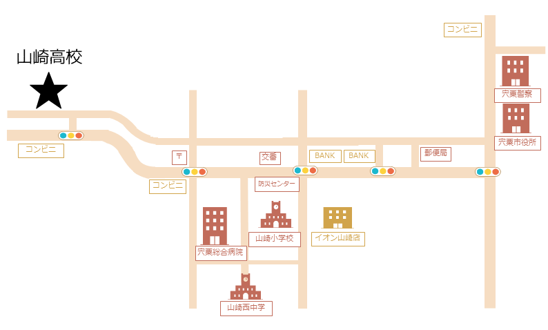 中国自動車道「山崎インター」下車後、国道29号線を北進し、「中広瀬」交差点を左折し、県道53号線を千種・三土方面にすすみ、「山崎高校前」交差点で右折後左折。