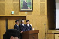 校長先生の式辞では、今年1年の各月の振り返りから、自分たちは今どのようなポジションにいて、どのように進んでいくかを考えてほしいこと、武力行使が行われている今、平和と経済的発展を継続していく責任があること、生成AIに使われる人ではなく、使える人材になってほしい、また、真偽がゆらぐ世の中において、本物を見極めるためには、多様な価値観をもち、真実に基づく情報で判断してほしいと話されました。また、読書の必要性も話され、『心に響く小さな5つの物語』から「縁を生かす」というお話を紹介していただきました。