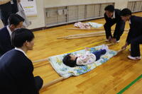 2年生は段ボールベッド作りと煙からの避難体験、簡易担架作り、各教室で防災クイズを生徒会役員中心に行いました。