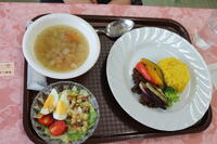 今回のランチメニューは、「キーマカレー、キノコとベーコンのスープ、彩り野菜とクルトンのサラダ、ガトーショコラ、かぼちゃプリン、コーヒー」です。