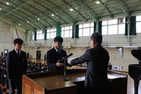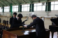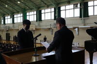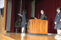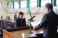 その後の表彰伝達式では、バドミントン部が、西西播地区後期バドミントン大会において、女子団体2年生の部で表彰され、2年生の米澤さんが表彰を受けました。吹奏楽部は、伊藤文化財団より奨励賞を授与され2年生の田路さんが表彰を受けました。また、第53回兵庫県アンサンブルコンテスト西播地区大会において2部門で入賞し、2年生の亀井さんと小川さんが表彰を受けました。また、男子バレーボール部が後期西播総合体育大会において、個人・団体で表彰され、2年生の久内さん、久保田さんが表彰されました。
