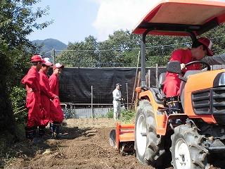 1年森林環境科学科の生徒が、「農業と環境」の時間にトラクタを使って畑を耕うんしました。トラクタを運転するのは初めてという生徒が多く、エンストを起こしたことで驚いた生徒もいました。トラクタはロータリが取りつけてあるため一度に広い面積を耕うんすることができ、しかも乗用なので生徒は喜んで実習しました。