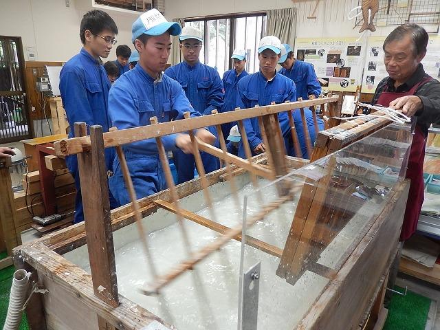 3年森林環境科学科林産加工コースの生徒が、「林産物利用」の時間に紙漉き(かみすき)体験を行いました。これは、佐用町にある皆田和紙保存会のみなさんを特別講師としてお招きして和紙について学ぶもので、今年で8年目です。第1回目の今日は、和紙の原料(コウゾ・ミツマタ・ガンピ)、和紙の歴史、製造工程について講義を受けた後、和紙に染料を用いて色付けをしました。染めあがった紙は乾燥させ、しばらく保存してうちわづくりに使用します。生徒は、あさがおやあじさいをイメージしたり、出来上がったうちわを家族にプレゼントすることを思い浮かべながら行いました。