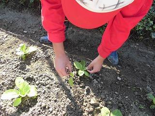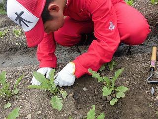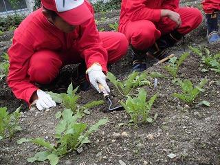 1年森林環境科学科の生徒が、「農業と環境」の時間にダイコン・ハクサイの栽培管理を行いました。ダイコン、ハクサイをは種して、およそ1か月が経ち、間引き・中耕・除草・土寄せを行いました。健康な苗を1株選び、それ以外の苗を取り除きました。続いて除草かまを使い、畝(うね)の表面の雑草を削り、削った土を株元に寄せました。その後、生育調査を行い、ダイコンが脱皮している様子を確認したり、害虫の糞を調べ害虫の調査を行いました。