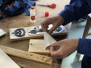 3年森林環境科学科林産加工コースの生徒が、「総合実習」の時間にハロウインの飾り「オーナメント」を作製しました。生徒は、紙に描いたデザインを杉板にのり付けし、糸鋸(いとのこ)を使い型を取りました。目、口は卓上ボール盤を使い穴をあけ、そこに糸鋸を通して切り取りました。仕上げはサンドペーパーで削り、最後に卓上ボール盤を使い穴を開け、そこに糸を通して出来上がりです。市内で行われるイベントで販売する予定です。
