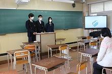 また、2年前に普通科教育類型を卒業し、この4月から幼稚園教諭となる第72回生の西岡さんも、リモート形式で発表してくれました。西岡さんは、大学生活の様子や就職活動、幼稚園教諭の採用試験について話し、「高校生活で学ぶことは必ず将来に生きる」と後輩たちへメッセージを伝えました。