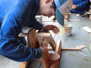 3年森林環境科学科の林産加工選択生徒が、「総合実習」の時間に間伐材を活用した木馬製作の仕上げを行いました。スギ材に各パーツの型枠をあわせ墨付けをし、糸ノコ盤で切りビスとボンドで組み立てます。使用する子供の安全面を考え、ベルトサンダーやサンドペーパーで丁寧に磨き、人体に優しいオイルワックスで仕上げました。