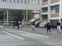 室内トレーニングの後、中庭で素振りとキャッチボールをしました。
