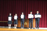 その後の表彰伝達式では、吹奏楽部が第52回兵庫県アンサンブルコンテスト西播地区大会において3部門で入賞し、2年生の笠波さんと進藤さん、西村さんが表彰を受けました。また、男子バレーボール部が後期西播総合体育大会において、個人・団体で表彰され、2年生の矢野さん、中尾さんが表彰されました。