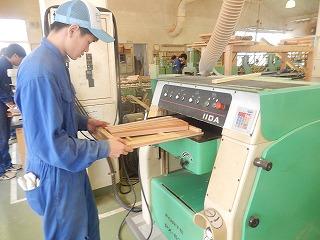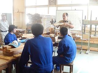 冨島先生による機械を安全に使う指導 プレーナーでスツールの脚の角度を調整しています