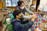 3回目は、前回骨組みを行った行灯に、自分で漉いて染めた和紙を貼り付けて、自分だけの行灯を完成させました。