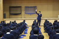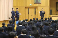3月18日(水)、宍粟警察署の東さん、網干警察署の池本さんにお越しいただき、1年生を対象に警察講話を行いました。4月から導入される自転車への青切符制度について生徒に分かりやすく説明していただきました。