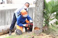 この日は、3年生が学校のプール横の樹木の伐採に挑戦しました。