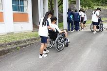 生徒たちはお互いに車いすを押しながら、校内のアスファルトの道や坂道を通行しました。車いすに乗っていると、地面の凹凸や斜面の感じ方がいつもと違います。また、足に力が入りにくい車いす利用者の感覚を知るため、一時的に車いすの上で正座をしてみる体験もありました。「どれくらいの速さで車いすを押せば、乗っている人が安心するか」「坂道を下るときには、乗っている人が安全で、怖くないよう、後ろ向きに降りる」など、実際に体験することで、今まで学んできた知識をより深く理解することができました。