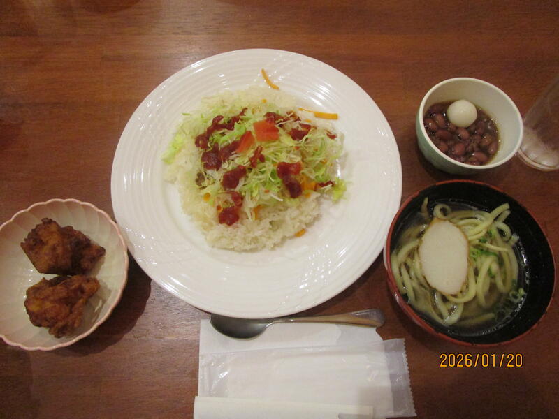 今日の昼食は、タコライス、沖縄ソバ、唐揚げ、あまがし(沖縄ぜんざい)でした。