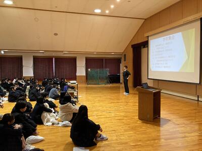 11月27日(木)のLHRで、夢野台高校の先輩でもある米田麻人さん(株式会社ZEROZIBA代表取締役)にお越しいただき「高校3年生の自分に伝えたかったこと」というタイトルで講演をしていただきました。『弱みを受け入れ、見方を変えることで自信をつくれる』というメッセージを伝えていただき、生徒たちも自分自身のことについて考えました。受験生としてしんどい時期でもあるので、少し気持ちが軽くなった人も多かったのではないでしょうか。自分に起こるすべてのことを前向きな気持ちでとらえ、乗り越えていってほしいです。