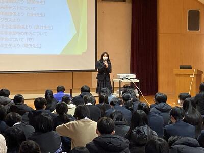 進路指導部の先生から共通テストの注意点を聞き、年始に学校で実施する共テのリハーサル模試についてお話を聞きました。あと3週間あまりとなった共通テストへ向けて気持ちを高めました。