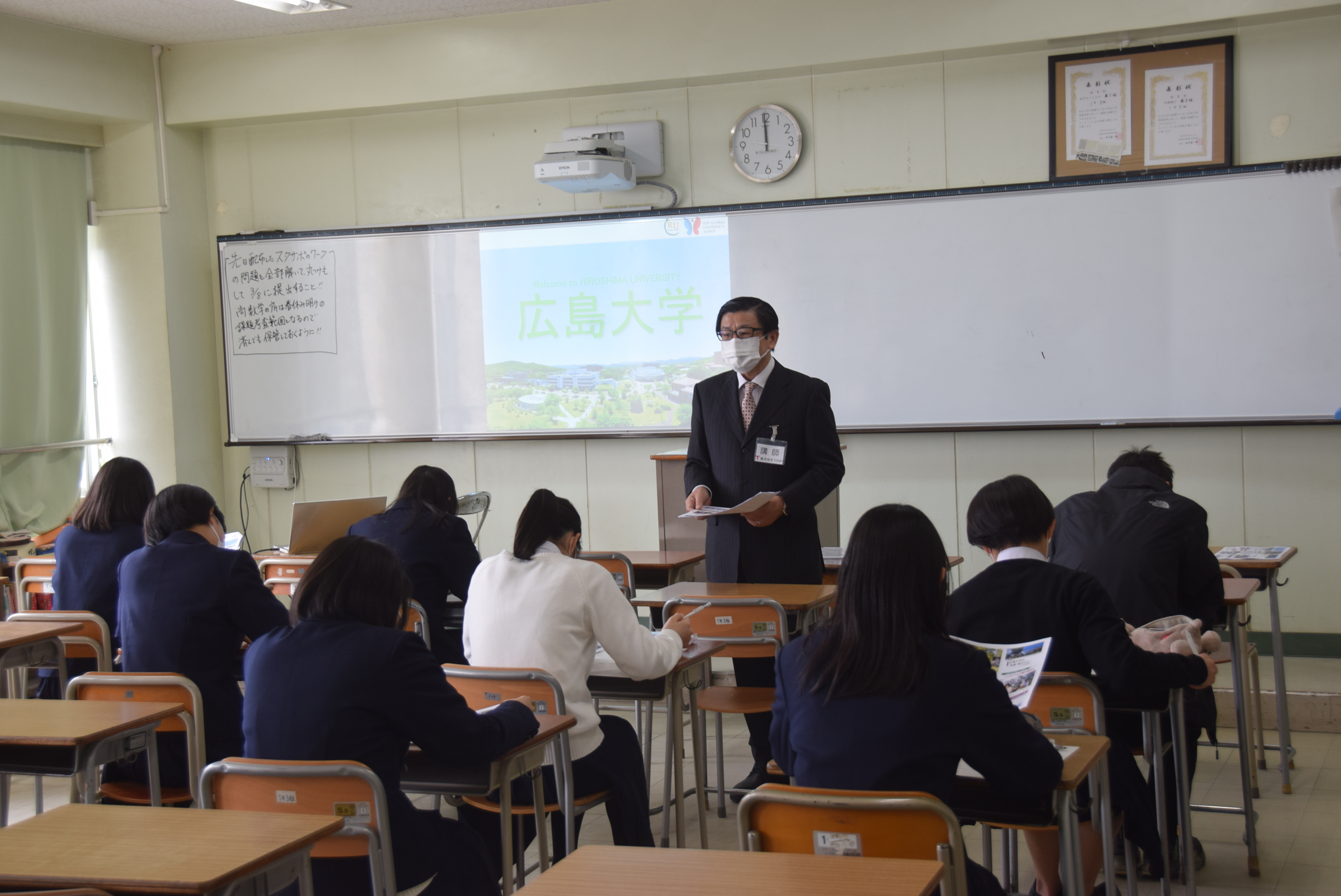 大学本部教育企画課から大川真澄様をお招きし、説明会を実施しました。3年生およそ40名が参加しました。大学の歴史、立地、学部編成などについて、わかりやすく説明していただきました。また、6学部それぞれについて特徴を教えていただきました。特に、どの学部も教員1人当たりの学生数が少なく、学生一人一人に対応できる環境が整っており、地域や企業からの評価も高く、就職も非常に良いこともわかりました。各学部の入試においては、英語では長文読解力、数学では微分積分、さらに普段の授業等で身につける知識の大切さが強調され、3年生にとってこれからの受験勉強の指針になる話もしていただきました。