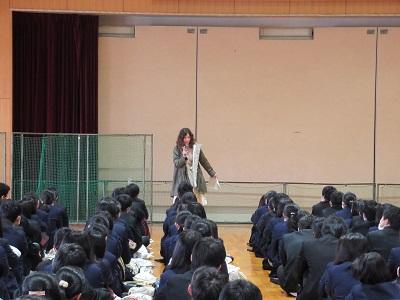 1月28日(月)に最後の学年集会を行いました。その中で、3年間ALTとして授業をしてくださったBetsy先生がスピーチをしてくださいました。