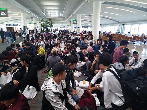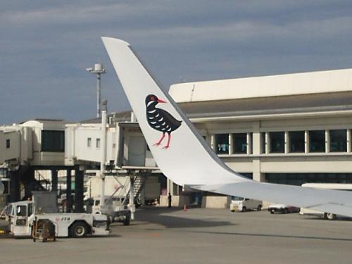 那覇までは学年全員が一緒に移動しましたが、那覇からは機材サイズの関係で3グループに別れての旅になります。1組4組5組が利用する機材の主翼にはヤンバルクイナがいました。
