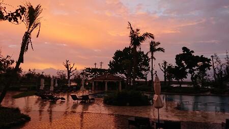 いよいよ修学旅行も最終日になりました。各クラス朝食をとり、ホテルブリーズベイマリーナに別れを告げます。小雨が降っていましたが、きれいな朝焼けを見ることができました。今日は那覇市内で班別研修です。