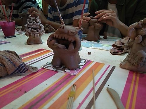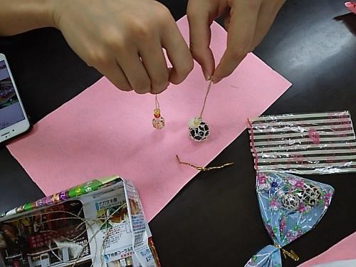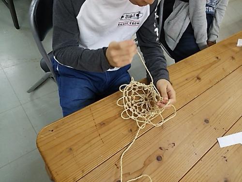 月桃の繊維でできたロープを編んで小物入れを作っています。繊維の爽やかな香りがします。