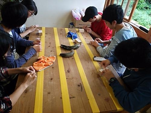 牛の角をヤスリで加工して、好みのデザインのアクセサリーを作っています。