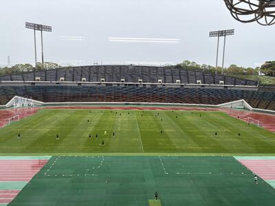 ユニバー記念競技場で午後のメイン競技に備えて準備をするグループ