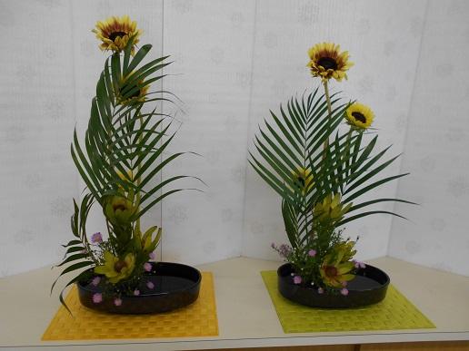まだまだ暑い日が続いていますが、季節は秋。今日は「ひまわり」がメインのお花ですが、真夏のイメージの黄色一色のひまわりではなくて、花びらにも少し焦げ茶色が混じった、秋を感じさせる花材でした。まっすぐに伸びたひまわりに、涼しげなグリーンのアレカヤシを添わせ、足下には活け花らしく「リュウカデンドロン」を、そしてちっちゃいピンクのお花がかわいらしい「クジャクソウ」をあしらいました。